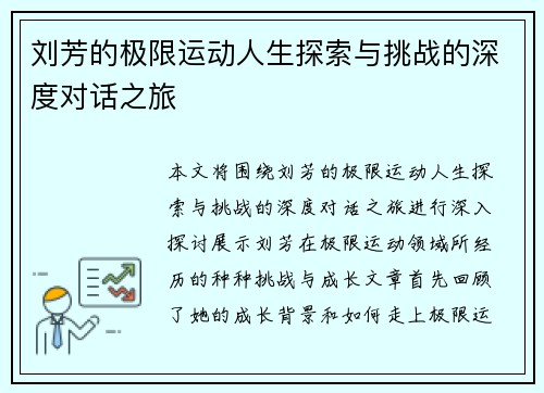 本文将围绕“刘芳的极限运动人生探索与挑战的深度对话之旅”进行深入探讨,展示刘芳在极限运动领域所经历的种种挑战与成长。文章首先回顾了她的成长背景和如何走上极限运动这条道路,其次分析了她在不同极限运动项目中的独特体验,再者探讨了这些经历对她个人心理素质和生活态度的影响,最后总结了她通过极限运动传递给他人...